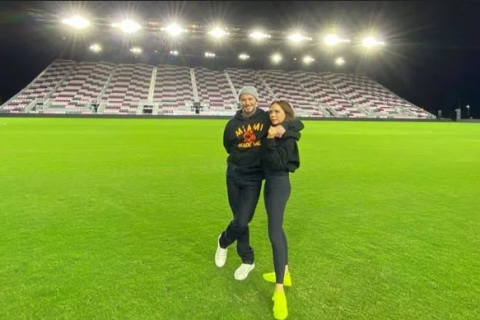 Με μμια φωτογραφία της αγκαλιά με τον David με τα χέρια τους τυλιγμένα μεταξύ τους σε ένα άδειο στάδιο, η πρώην Spice Girl έγραψε: «Η οικογένεια και εγώ είμαστε εδώ στο Μαϊάμι για την έναρξη της ομάδας του @ davidbeckham.